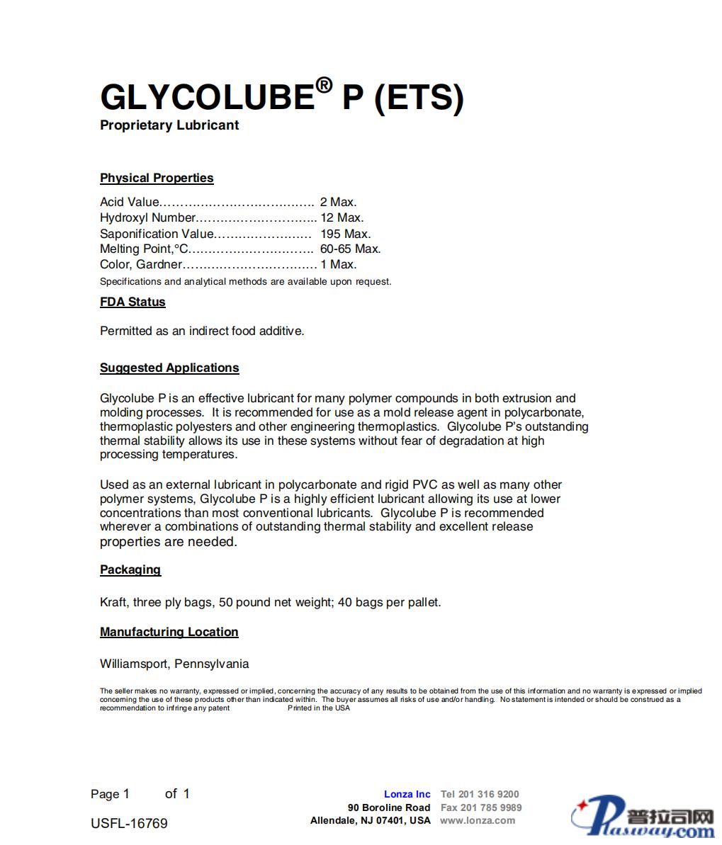 在挤出和塑模加工过程中,Glycolube P对很多聚合物来说都是一个有效的润滑剂;推荐用于PC(聚碳酸酯)、热塑性聚酯(PET,PBT等)、PPO、PPS及它的热塑性工程塑料。Glycolube P突出的热稳定性,使它可用于此类体系的加工过程,不用担心发生降解;同时它可以显著改善透明性及表面光洁度。