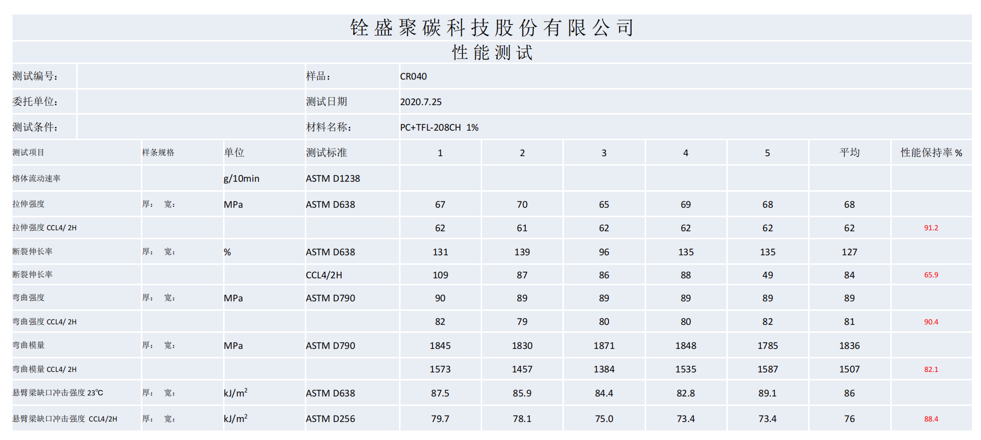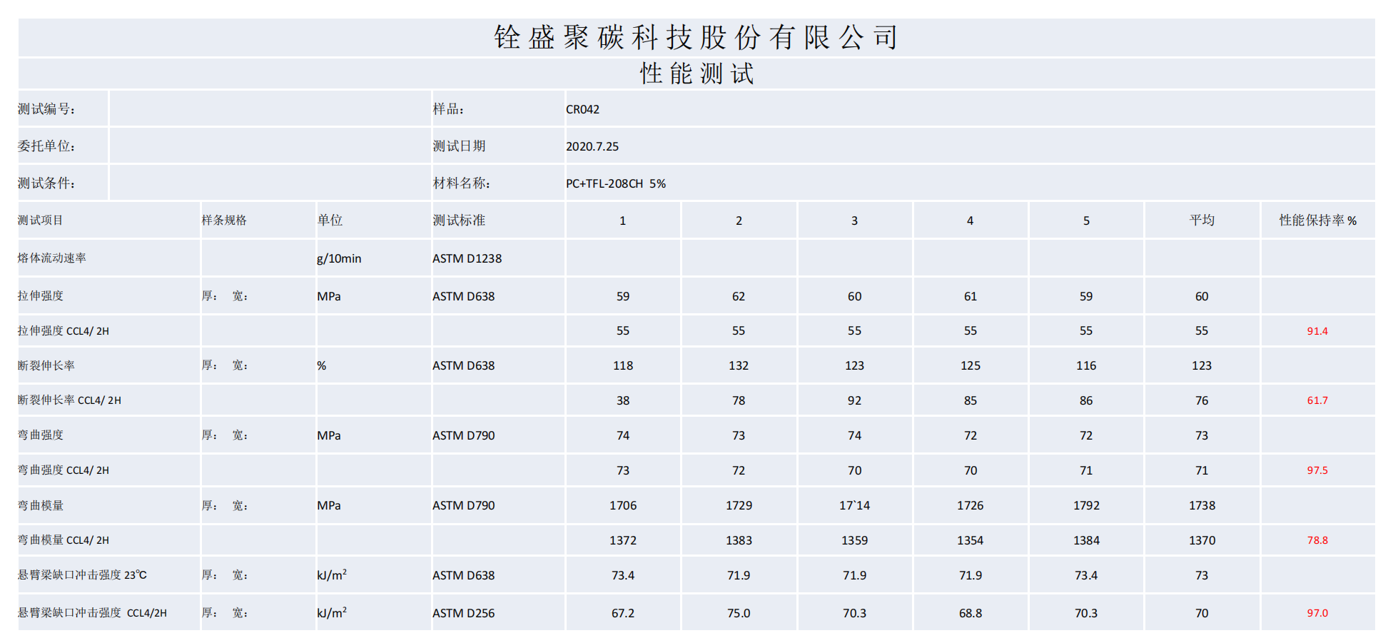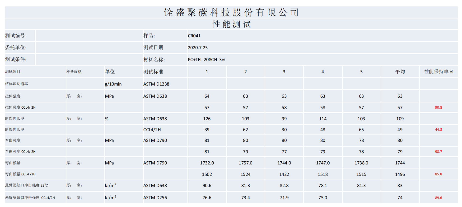 TFL-208CH是我司特殊工艺开发推出的官能团活化的硅-丙共聚树脂,具有优秀的耐化学性,同时兼具相容、增韧功能。当PC树脂添加TFL-208CH混合造粒成型后,经过化学试剂浸泡后,物理-机械性能保持率75-95%之间。