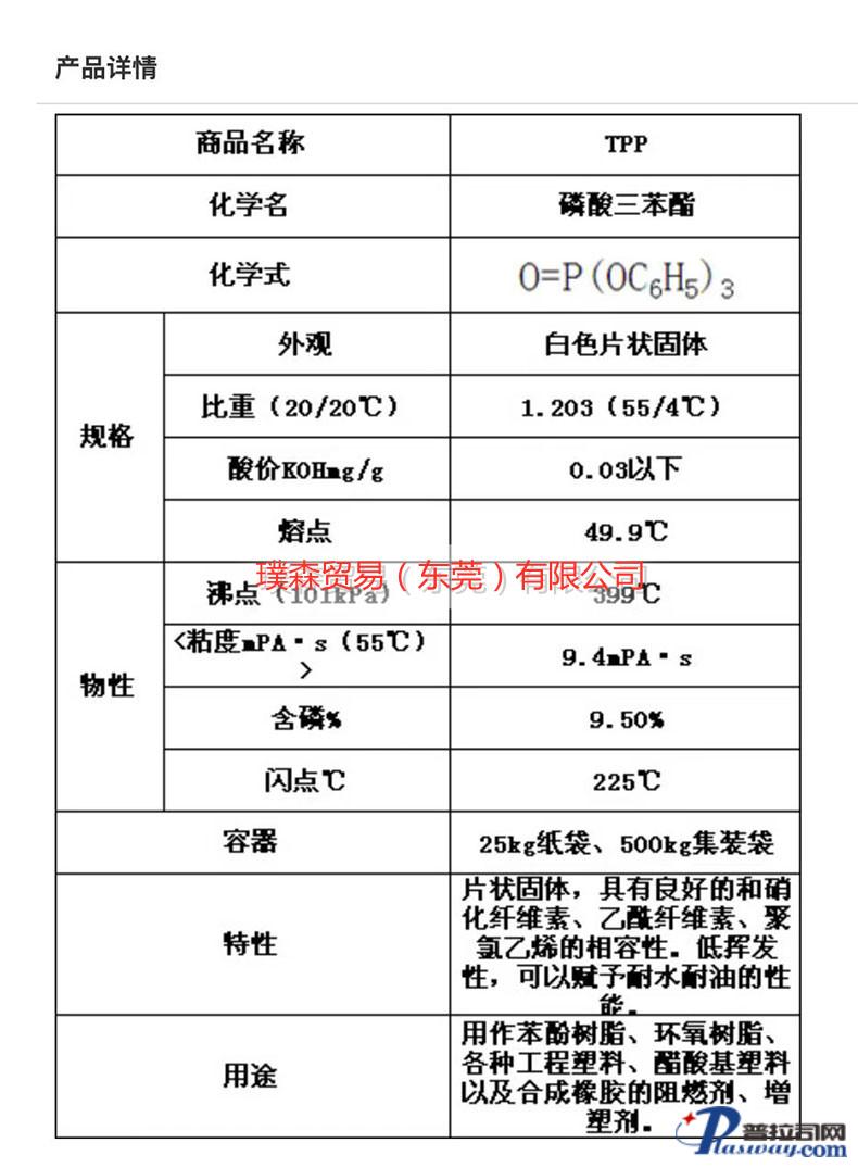 磷酸三苯酯(阻燃剂TPP)是种含磷元素的化合物,可用作无卤环保型阻燃剂,用于溶解于有机溶剂。分子式OP(OC6H5)3。外观为白色、无臭结晶粉末,微有潮解性;蒸汽压0.01kPa/20℃;闪点220℃;熔点47-53℃;沸点370℃;溶解性:不溶于水,微溶于醇,溶于苯、氯仿、丙酮,易溶于乙醚。