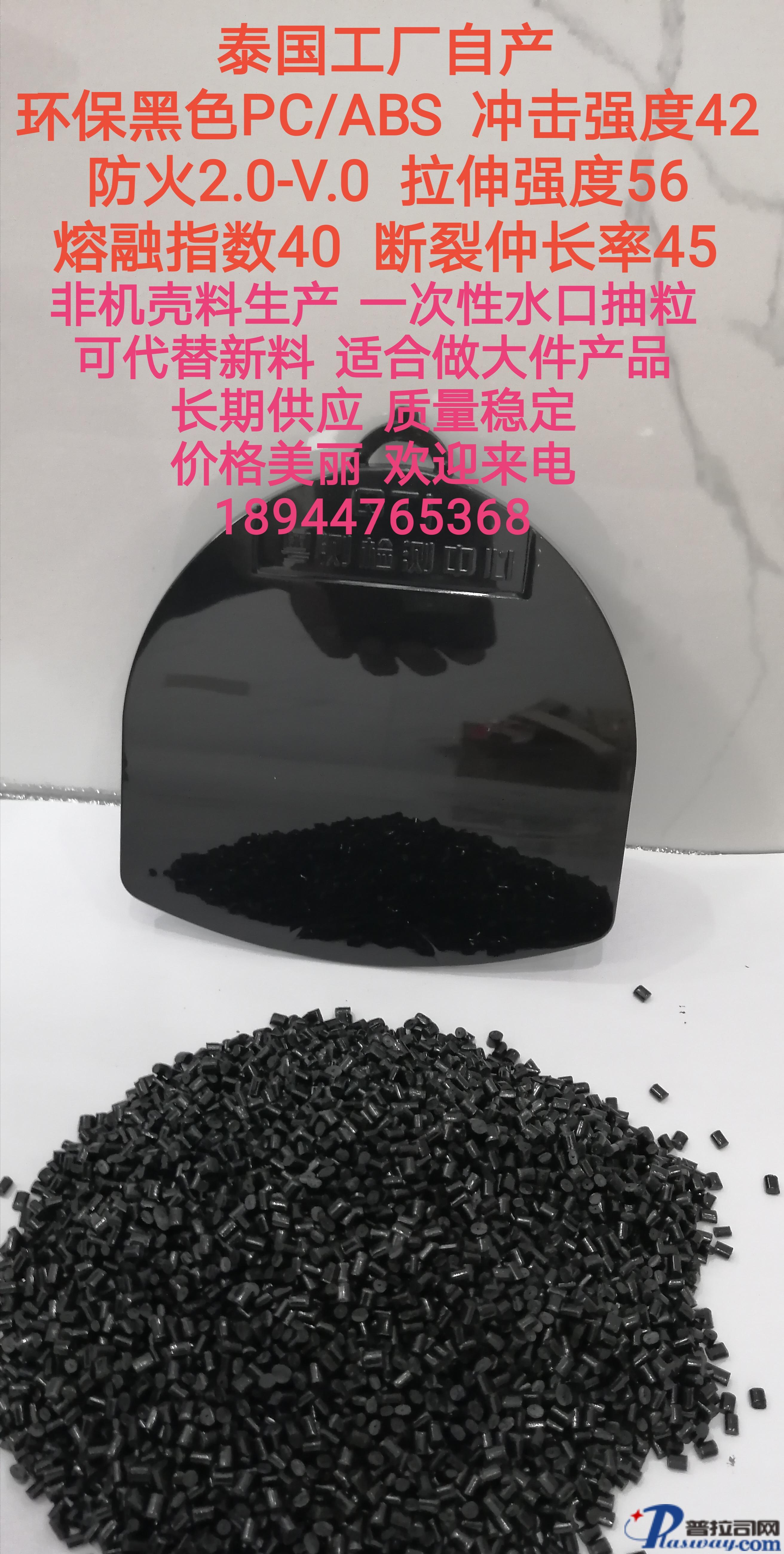 泰国工厂自产, 环保黑色高光,防火2.0-V.0, 冲击强度42,熔融指数40,断裂伸长率45,拉伸强度56,