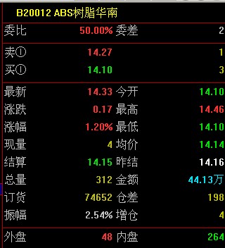 市场分析渤海商品交易所ABS树脂(华南)昨日结算价14160元/吨;今日开盘14100 元/吨;截止今日9:30最新价格14330元/吨,涨了170元/吨;交易型号为宁波LG HI-121H。