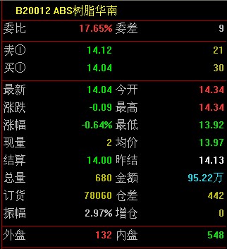 市场分析渤海商品交易所ABS树脂(华南)昨日结算价14130元/吨;今日开盘14340 元/吨;截止今日9:30最新价格14040元/吨,跌了90元/吨;交易型号为宁波LG HI-121H。