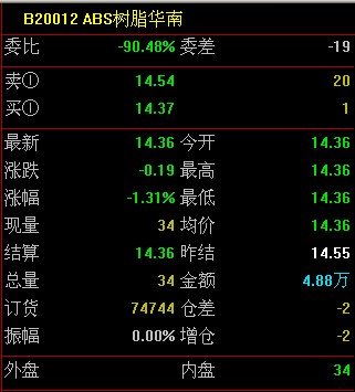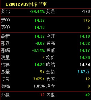 市场分析渤海商品交易所ABS树脂(华南)昨日结算价14340元/吨;今日开盘14180 元/吨;截止今日9:30最新价格14320元/吨,跌了20元/吨;交易型号为宁波LG HI-121H。