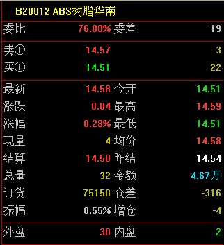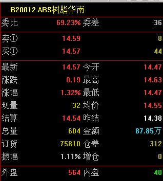 市场分析渤海商品交易所ABS树脂(华南)昨日结算价14540元/吨;今日开盘14510 元/吨;截止今日9:30最新价格14580元/吨,涨了40元/吨;交易型号为宁波LG HI-121H。