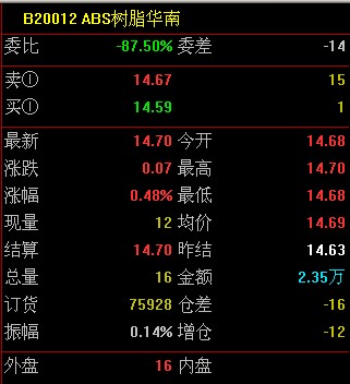 市场分析渤海商品交易所ABS树脂(华南)昨日结算价14630元/吨;今日开盘14700 元/吨;截止今日9:30最新价格14680元/吨,涨了70元/吨;;交易型号为宁波LG HI-121H。