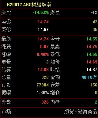 市场分析渤海商品交易所ABS树脂(华南)昨日结算价14670元/吨;今日开盘14550 元/吨;截止今日9:30最新价格为14740元/吨,涨了70元/吨;;交易型号为宁波LG HI-121H。