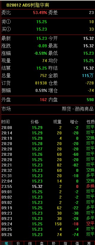 市场分析渤商所ABS树脂(华南)昨日结算价15320元/吨;今日开盘15320 元/吨;截止今日9:30最新价格为15230元/吨,跌了90元/吨;;交易型号为宁波LG HI-121H。