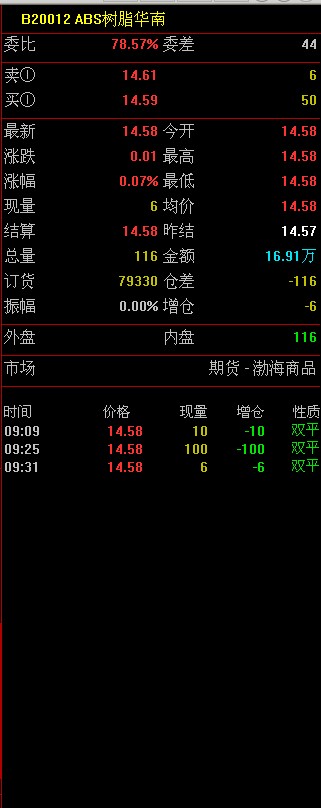 市场分析渤海商品交易所ABS树脂(华南)昨日(2月8日)结算价14570元/吨;今日开盘14580 元/吨;截止今日9:40最新价格为14580元/吨,涨了10元/吨;;交易型号为宁波LG HI-121H。