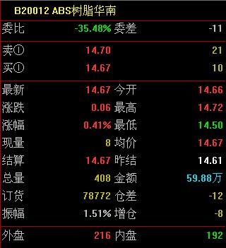 市场分析渤商所ABS树脂(华南)昨日结算价14610元/吨;今日开盘14660 元/吨;截止今日9:30最新价格为14670元/吨,跌了60元/吨;;交易型号为宁波LG HI-121H。