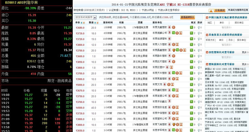 市场分析ABS树脂(华南)于2013年12月27日在渤海商品交易所挂牌上市,交收型号为宁波LG HI-121H。渤商所ABS树脂(华南)今日最新价格为15390元/吨,普拉司网现货华南市场报价(http://www.plasway.com/price/price_desc-35-211-58-74-0.html)平均为14800元/吨,线上线下均差600元/吨。