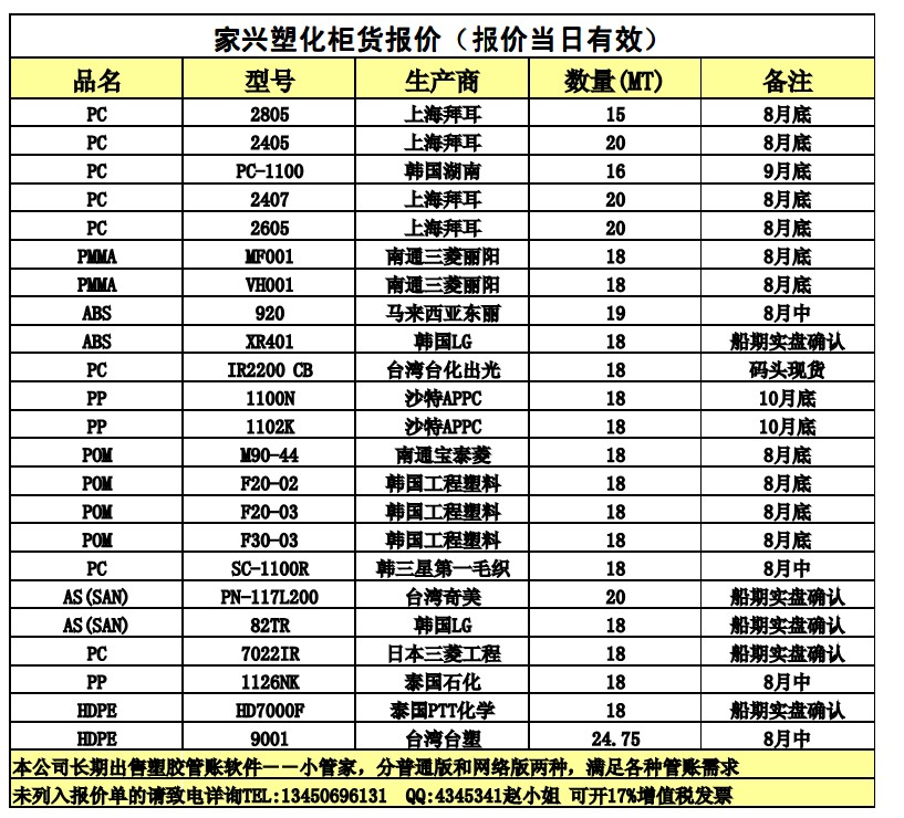 8月7日厦门PE市场混乱整理主导,线性货源略有松动,商家谨慎观望为主,交投略显僵持。参考报价:高压大庆2426H报12650-12700,兰化2426H报12650-12700;线性福炼7042报11750-11900,7050报11900,2220报11900-11950,1820报11900-11950,兰化7042N报11800-11850;低压:独山子8008报11500-11550,大庆5000S报11950-12000,大庆8008报11450,伊朗7000F报11380左右,BL3报11250。单位:元/吨。【详情】