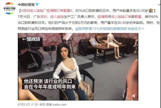 市场分析近日,澎湃新闻记者来到位于广东省深圳市的成 人娃娃生产工厂,工厂负责人表示,娃娃的海外出口量现在越来越高,往常每月出口3000个左右,今年增长了1倍还多。同时,随着线下体验店这种新模式的兴起,国内市场也逐渐被打开。