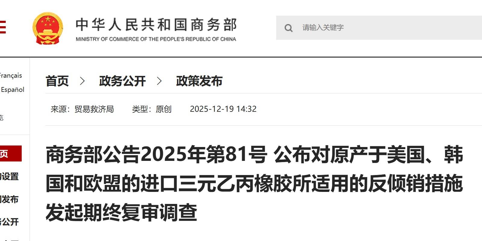 时事政策商务部今日发布公告,公布对原产于美国、韩国和欧盟的进口三元乙丙橡胶所适用的反倾销措施发起期终复审调查。