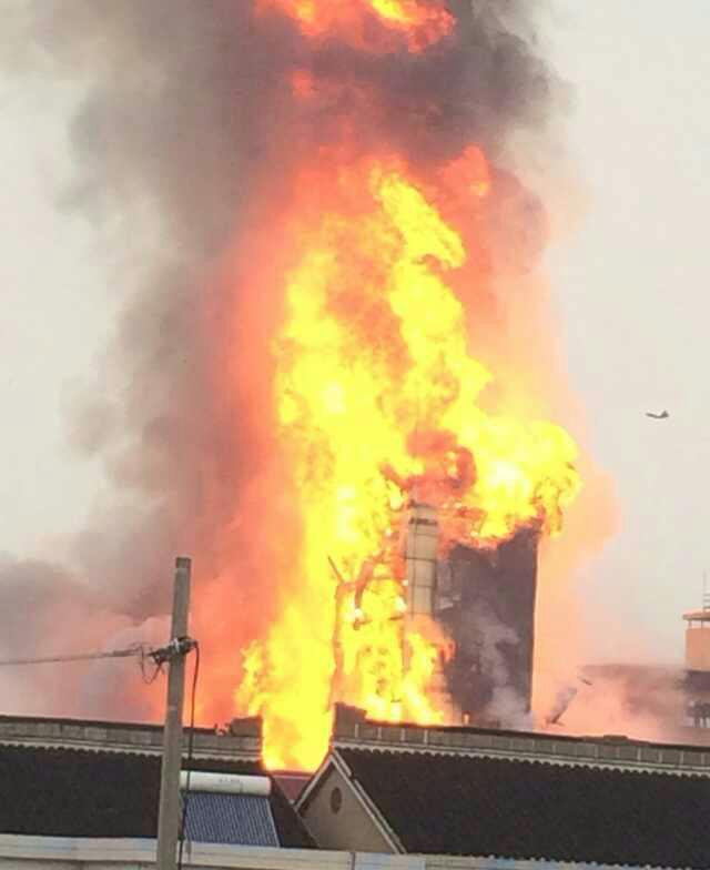 在现场,5公里外就能看到滚滚浓烟。由于火势较大,现场又有众多桶装化工原料,还有油漆、生产设备等,随时都有引燃发生爆炸的危险。消防战士用两支水枪从厂房东西两侧形成左右合击,对火势进行压制,并对桶装聚丙酸、油漆、设备等位置打水降温,防止发生爆炸。在扑救的过程中,泄漏的化工原料流淌到下水道中发生了小型爆炸,井口被炸开,井盖被炸烂。【详情】