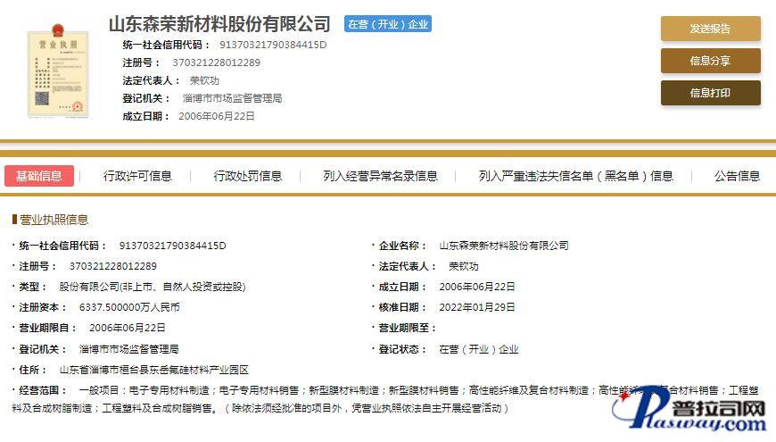山东森荣新材料股份有限公司创建于2006年,地处中国膜谷-山东·淄博东岳经济开发区,是拉长东岳氟材料产业链的下游深加工企业。公司主要产品有聚四氟乙烯微孔膜、聚四氟乙烯纤维、聚四氟乙烯工程塑料三大类。公司是集科研、生产、经营和对外贸易于一体的高新技术企业,是中国膜工业协会理事单位,中国氟塑加工专业委员会理事单位、山东省企业技术中心、超微过滤纤维技术中心,先后获评“好品山东”、“山东省著名商标”、“山东省中小企业发展新经济示范单位”、“山东省隐形冠军培育企业”、“山东省两化融合贯标试点单位”、“山东省专精特新中小企业”、“山东省瞪羚企业”、“中国氟塑加工新锐成长企业”、“国家级专精特新小巨人企业”等荣誉称号。十五年磨一剑!公司现已发展成为中国聚四氟乙烯下游深加工规模、实力一流的企业!