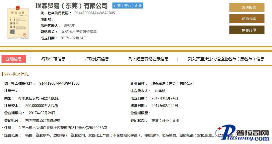 | 经营范围 | 销售:塑胶原料、塑胶辅料、塑胶助剂、其他化工产品(不含危险化学品)、橡胶原料、包装制品、塑胶制品;货物进出口、技术进出口。(依法须经批准的项目,经相关部门批准后方可开展经营活动)〓 | ||||