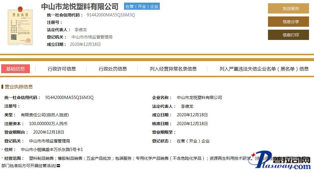 | 企业名称 | 中山市龙悦塑料有限公司 | 法人代表 | 李德龙 | 统一社会信用代码 | 91442000MA55Q16M3Q |