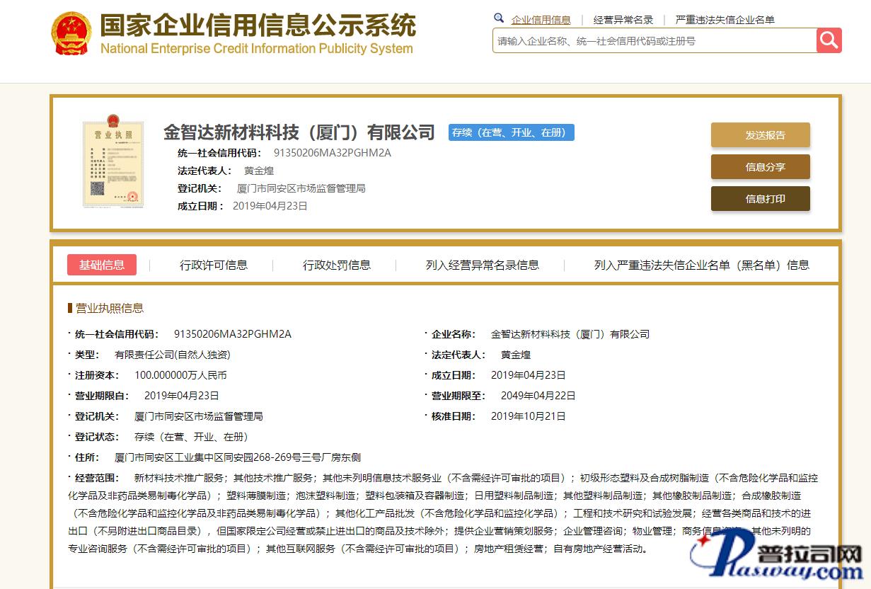 | 企业名称 | 金智达新材料科技(厦门)有限公司 | 法人代表 | 黄金煌 | 统一社会信用代码 | 91350206MA32PGHM2A |