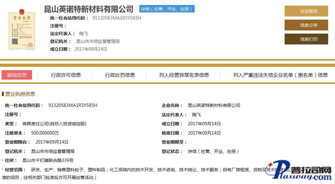 | 经营范围 | 研发、生产、销售塑料粒子、塑料制品;化工领域内的技术开发、技术咨询、技术转让、技术服务;自有厂房租赁、货物及技术的进出口业务。(依法须经批准的项目,经相关部门批准后方可开展经营活动) | ||||