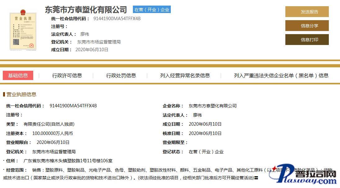 | 企业名称 | 东莞市方泰塑化有限公司 | 法人代表 | 廖伟 | 统一社会信用代码 | 91441900MA54TFFX4B |