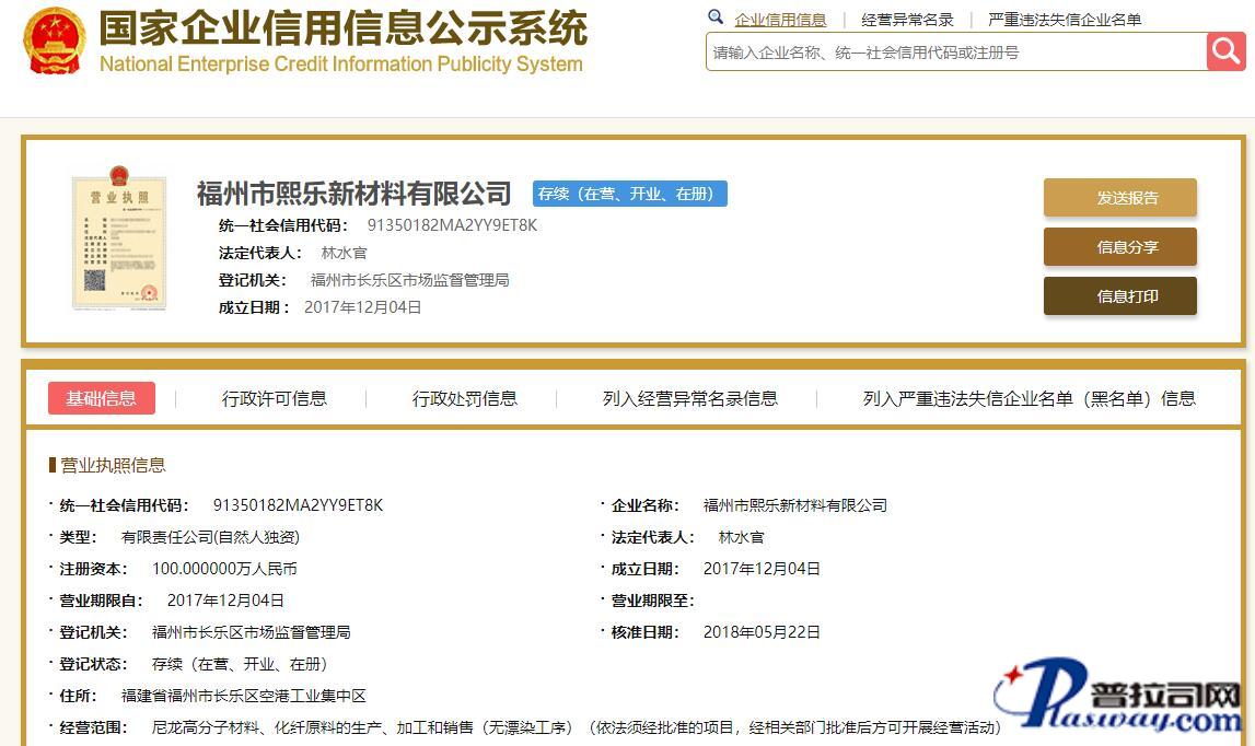| 企业名称 | 福州市熙乐新材料有限公司 | 法人代表 | 林灯亮 | 统一社会信用代码 | 91350182MA2YY9ET8K |