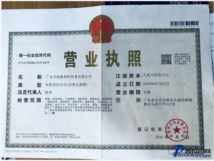 | 企业名称 | 广东合政新材料贸易有限公司 | 法人代表 | 陈欢 | 统一社会信用代码 | 91441900MA54YF487F |