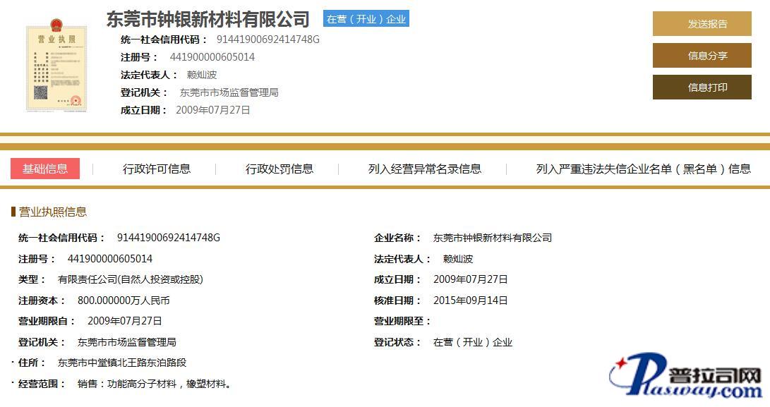 | 企业名称 | 东莞市钟银新材料有限公司 | 法人代表 | 赖灿波 | 统一社会信用代码 | 91441900692414748G |