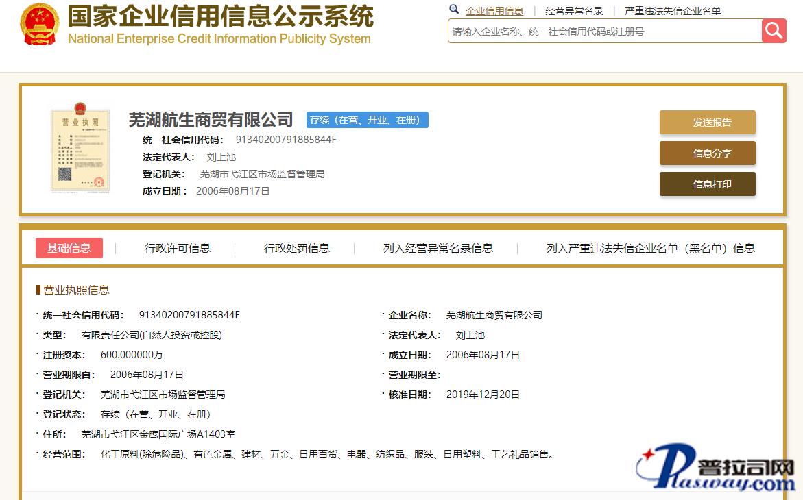 芜湖航生商贸有限公司位于中国安徽省芜湖市金鹰世界中心,公司成立于2006年,是一家年销售额超3亿,以代理经销全球知名石化企业的塑胶原料为主营业务的有限责任公司,是宁波乐金甬兴化工有限公司ABS,SAN在全国范围内的主要分销商及安徽区域的唯一指定代理商。所经营的塑料化工原料畅销消费者市场,公司与多家生产商建立了长期稳定的合作关系。公司经销的塑胶原料品种齐全、价格合理,供应稳定。芜湖航生商贸有限公司实力雄厚,重合同、守信用、保证产品质量,通过常年的经营实践,赢得了广大客户的信任,连年被政府评为A级纳税人。目前除开展人民币业务以外,还通过其香港航生商贸有限公司大力开展ABS、AS、PC/ABS等原料的保税核销业务(美金交易),是宁波LG甬兴化工在华东地区进行美金交易的唯一指定报价窗口。