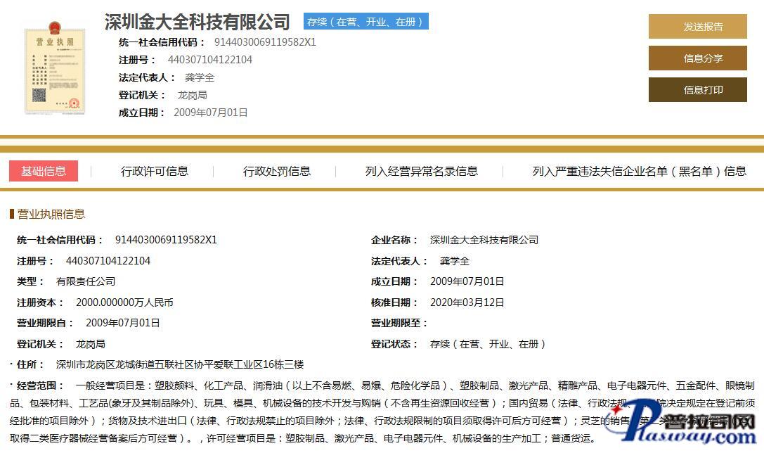 | 经营范围 | 一般经营项目是:塑胶颜料、化工产品、润滑油(以上不含易燃、易爆、危险化学品)、塑胶制品、激光产品、精雕产品、电子电器元件、五金配件、眼镜制品、包装材料、工艺品(象牙及其制品除外)、玩具、模具、机械设备的技术开发与购销(不含再生资源回收经营);国内贸易(法律、行政法规、国务院决定规定在登记前须经批准的项目除外);货物及技术进出口(法律、行政法规禁止的项目除外;法律、行政法规限制的项目须取得许可后方可经营);灵芝的销售;第二类医疗器械销售(需取得二类医疗器械经营备案后方可经营)。,许可经营项目是:塑胶制品、激光产品、电子电器元件、机械设备的生产加工;普通货运。 | ||||