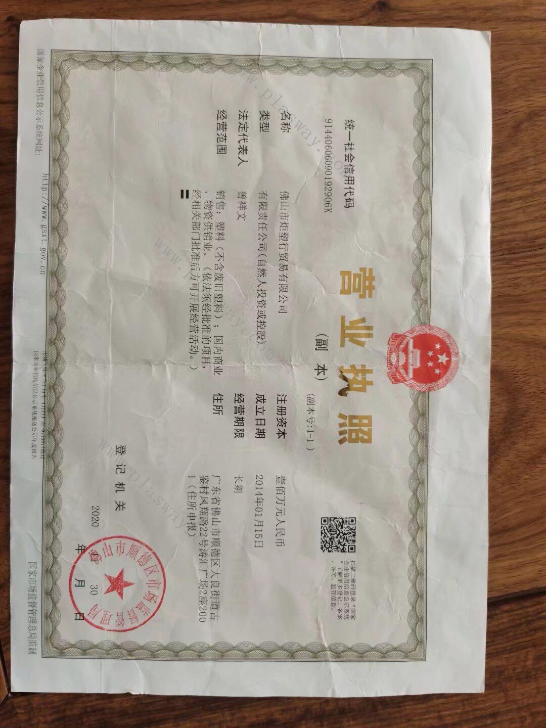 | 企业名称 | 佛山市炬塑行贸易有限公司 | 法人代表 | 曾祥文 | 统一社会信用代码 | 91440606090192906K |