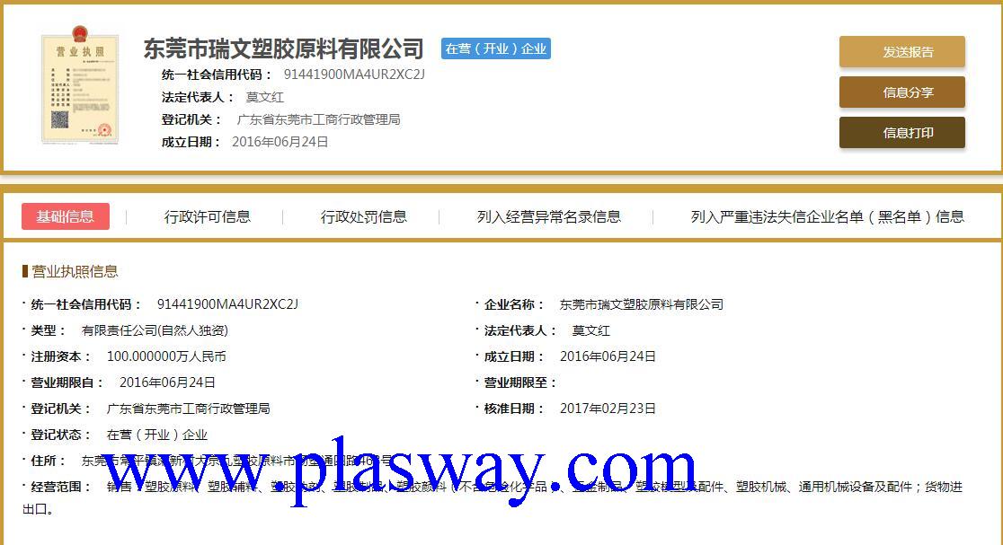 | 经营期限 | 2016-06-24 至 无固定期限 | 注册地址 | 东莞市常平镇漱新村大京九塑胶原料市场塑通四路468号 | ||