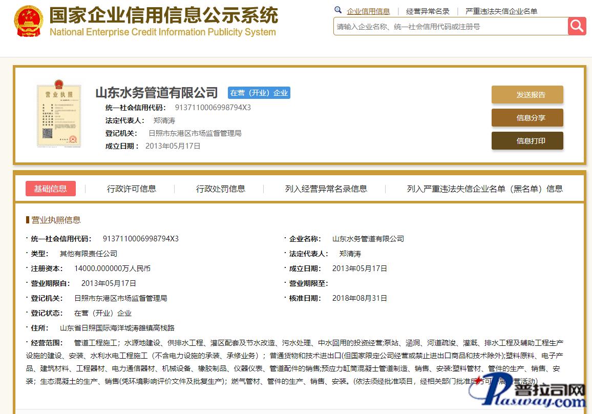 山东水务管道有限公司是山东省水利厅直属水发集团有限公司的子公司。注册资金14000万元,是一家生产、销售PVC\HDPE等管材管件,销售塑胶塑料原材料,从事水利水电工程施工于一体的国有大型企业。